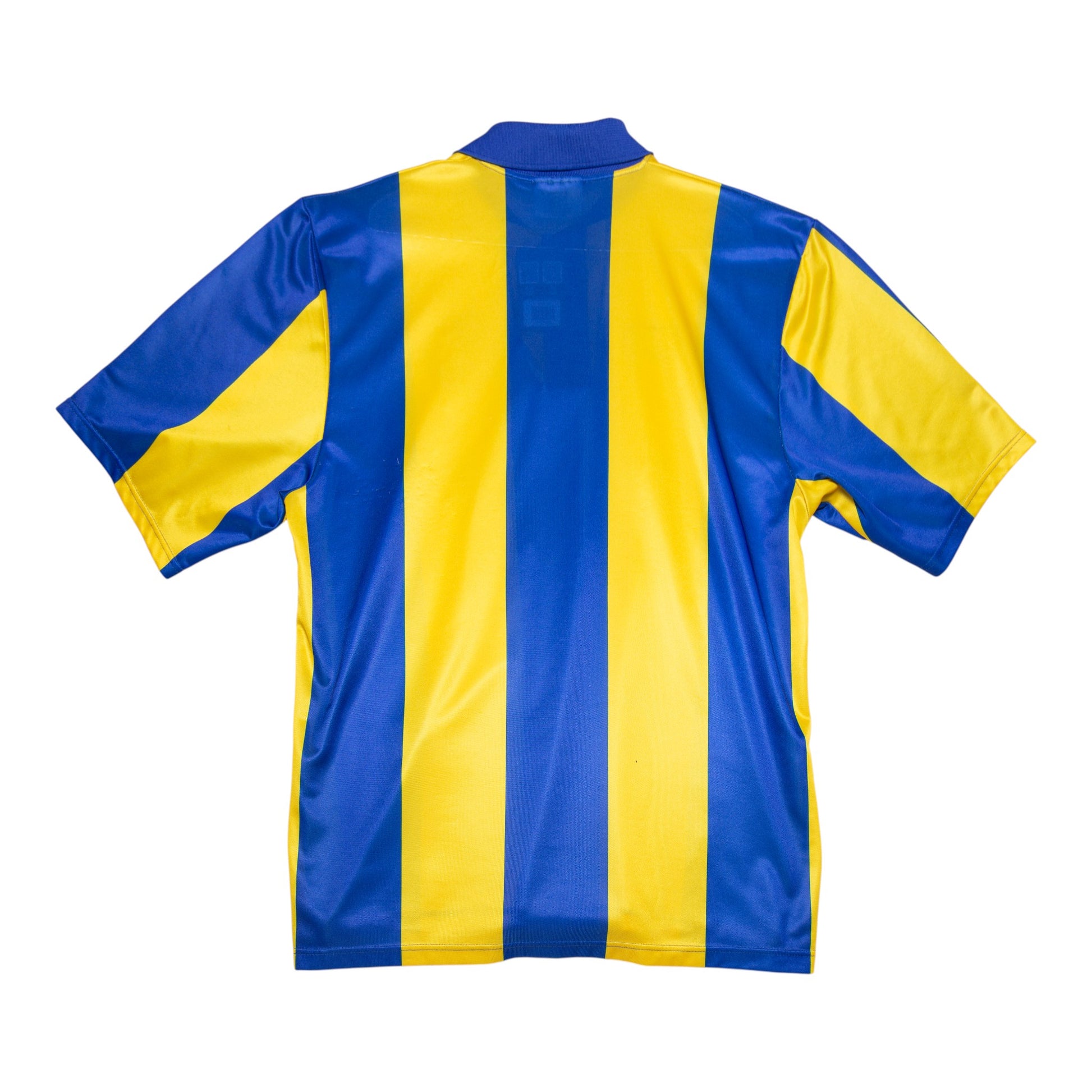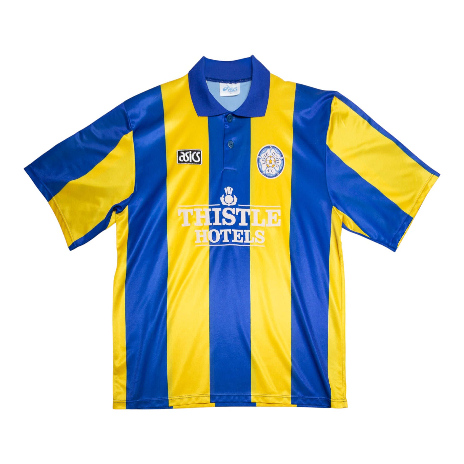 Colourway: Traditional vibrant yellow with bold blue trim — a standout away colour scheme that reflected Leeds’ distinctive 90s identity.